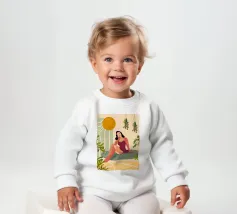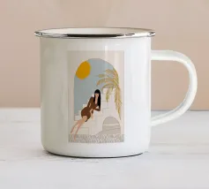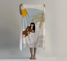 Un'elegante illustrazione di una donna che si rilassa su una scala illuminata dal sole accanto a una palma in vaso, con un gatto seduto vicino. La scena, incorniciata da un arco, è serena, elegante e ha un'atmosfera mediterranea classica.