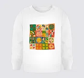 Un motivo vivace e intricato che ricorda una trapunta, composto da vari quadrati con simboli e disegni geometrici ispirati all'arte popolare. La ricca tavolozza di colori crea un'atmosfera calda e artigianale.