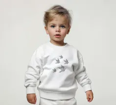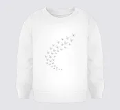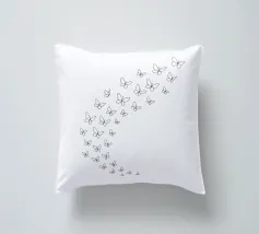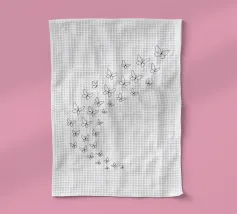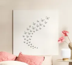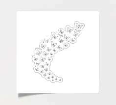 Molte piccole farfalle si muovono in diagonale sulla superficie, dal basso a sinistra all'alto a destra. Ogni farfalla è disegnata come un contorno ridotto; ali, corpo e antenne sono definiti solo da linee sottili. C'è molto spazio tra le singole figure, facendo apparire lo sciame leggero e permeabile. Lo spazio bianco circostante è volutamente ampio e rafforza l'impressione di movimento e di calma allo stesso tempo.