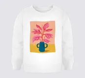 Un'illustrazione semplice ma d'effetto di una pianta dalle foglie rosa in un audace vaso blu su uno sfondo caldo, che celebra la bellezza del colore e della forma botanica minimalista.
