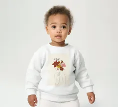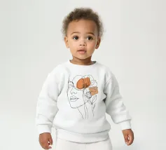 Un disegno al tratto minimalista raffigura un volto sereno intrecciato con un grande fiore arancione e foglie verdi. L'uso di linee semplici e di tonalità della terra crea una composizione elegante e rilassante.