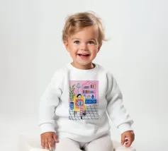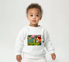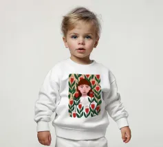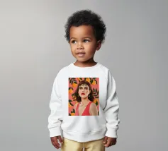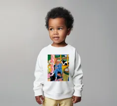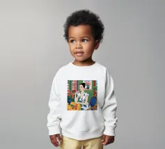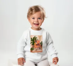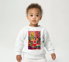 Questa opera d'arte raffigura una persona seduta in una stanza colorata che indossa abiti a righe. Lo sfondo comprende varie piante e mobili, creando un ambiente accogliente e sereno.