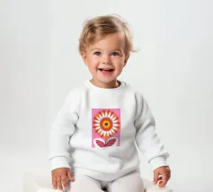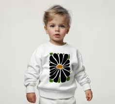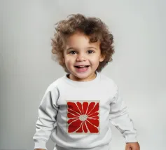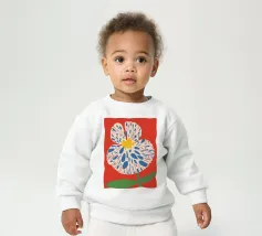 Un'illustrazione audace e grafica di un singolo grande fiore, probabilmente un anemone, con petali a strisce bianche e blu e un centro giallo. Lo sfondo rosso brillante rende il fiore il fulcro assoluto di questo pezzo potente.