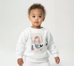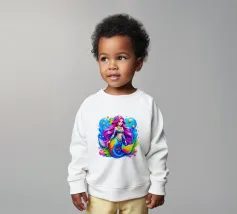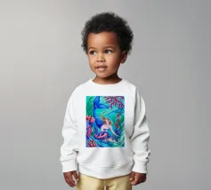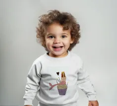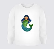 L'illustrazione mostra un'allegra sirena con lunghi e fluenti capelli blu, guance rosee e un ampio sorriso. La sua parte superiore ricorda le squame di un pesce e la sua pinna caudale è blu con accenti verdi. Lo stile è giocoso e infantile, con linee pulite e colori vivaci. La texture sullo sfondo conferisce all'immagine un tocco artigianale e affascinante.
