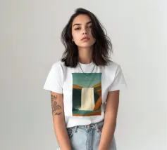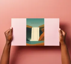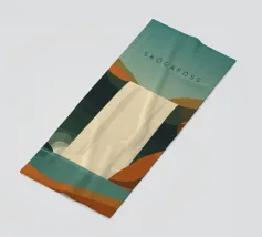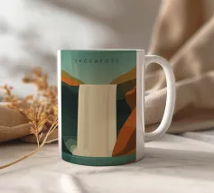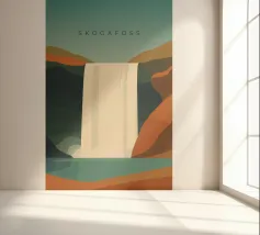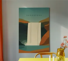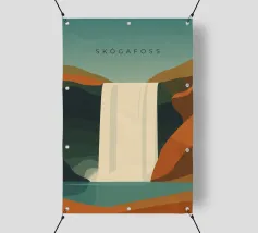 Design da viaggio minimalista dell'Islanda con la famosa cascata Skogafoss in stile stilizzato. Ideale per tutti coloro che amano questo splendido Paese scandinavo con la sua impressionante natura.