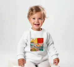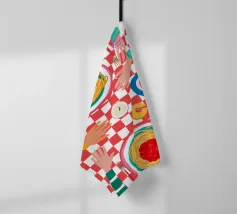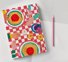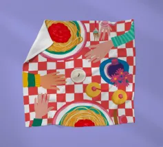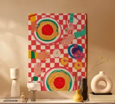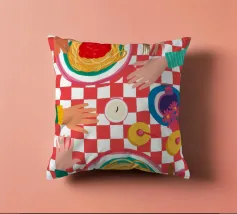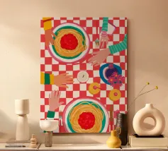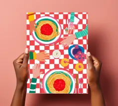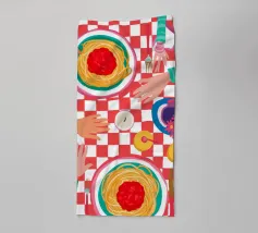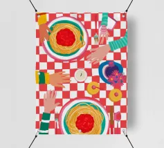 Una vista dall'alto di mani che condividono un grande piatto di spaghetti su una tovaglia a scacchi rossi e bianchi. La scena è una rappresentazione classica, gioiosa e un po' caotica di un pasto comune italiano.