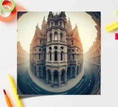 Un maestoso edificio in stile gotico con dettagli ornamentali è rappresentato con una surreale distorsione circolare. Le strade curve e la luce dorata creano un'atmosfera onirica e ultraterrena, fondendo eleganza classica e astrazione artistica.
