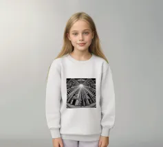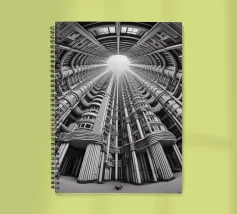 Una prospettiva monocromatica fisheye di un'architettura cilindrica futuristica, che mostra motivi intricati, strutture tubolari e simmetria verticale, tutti convergenti verso una fonte luminosa centrale. Il design enfatizza l'innovazione, la profondità e l'armonia strutturale.
