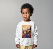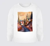 Una strada tortuosa fiancheggiata da alti cipressi è immersa nella calda luce dorata del crepuscolo; lo stile espressivo e pittorico crea un viaggio sognante e romantico attraverso la campagna.