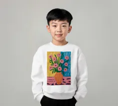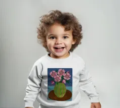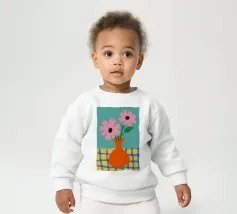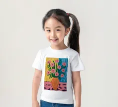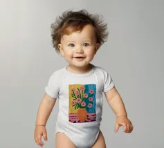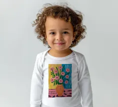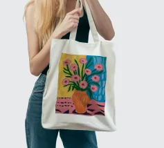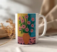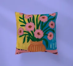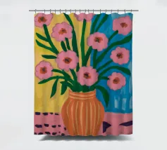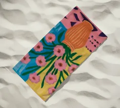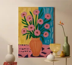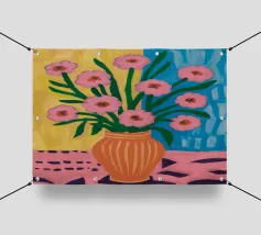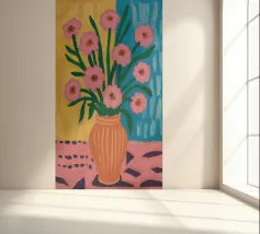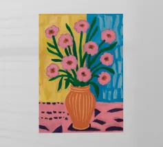Un bouquet di fiori rosa in un vaso di terracotta poggia su una superficie a motivi rosa e neri. Lo sfondo è un blocco di turchese vibrante, che crea una composizione giocosa ed elegante che celebra il colore e il motivo.
