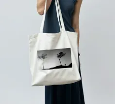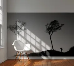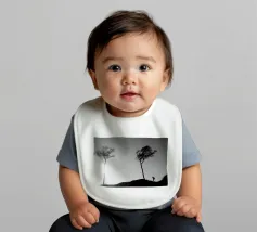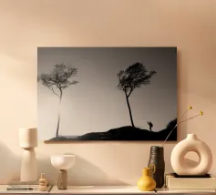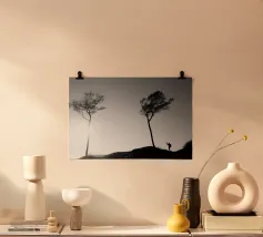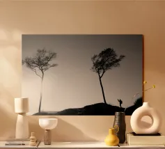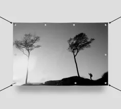 Fotografia di alberi sulla costa del Mar Baltico e di una persona che li fotografa. Fotografia decorativa in bianco e nero.