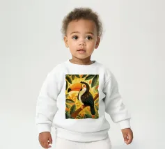 Una vivace illustrazione di due tucani dal becco colorato appollaiati su un ramo in mezzo a un rigoglioso fogliame tropicale, resa in uno stile grafico e audace.