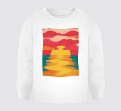 Una rappresentazione drammatica e minimalista di un tramonto sull'oceano, con un sole cremisi che si riflette sull'acqua. I colori decisi e le forme semplici creano una scena potente e suggestiva.