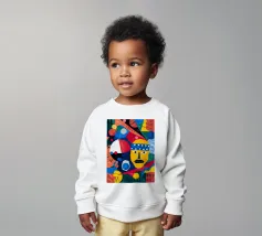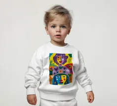 Un ritratto astratto potente e crudo di tre volti, reso con colori primari audaci di rosso e blu e contorni neri, che trasmettono un'energia primordiale e cubista.