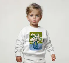 Una vivace natura morta di un bouquet di tulipani rosa in un audace vaso a righe bianche e blu. La composizione è fresca, grafica e piena di energia primaverile.