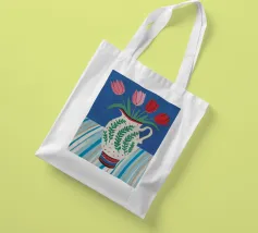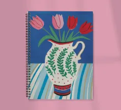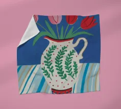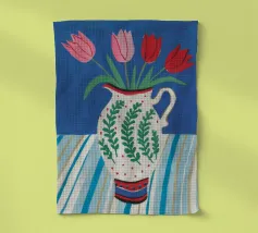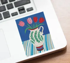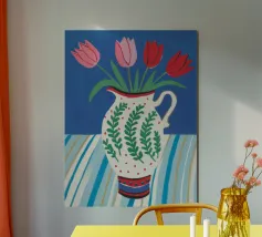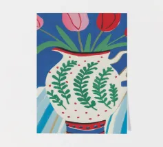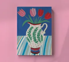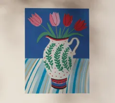 Tulipani rossi e rosa sono elegantemente esposti in una brocca bianca decorata con motivi di foglie verdi. La brocca poggia su una superficie a strisce bianche e blu, su uno sfondo scuro, creando un look classico e raffinato.
