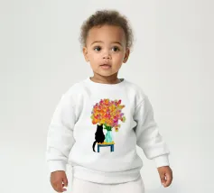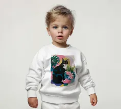 Un gatto bianco e nero siede tranquillamente su un tavolo coperto da un morbido panno rosa a fantasia. Accanto al gatto c'è un vaso giallo che contiene un bouquet di grandi tulipani rosa. Lo sfondo è costituito da una parete verde menta con ombre di foglie e da una carta da parati tropicale con motivi botanici verdi e rosa. La scena è tranquilla ed equilibrata, con un mix giocoso di comfort interno e lussureggianti elementi decorativi.