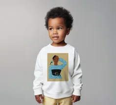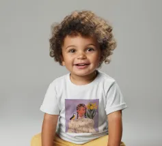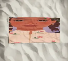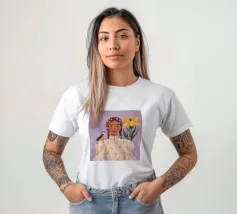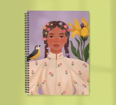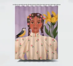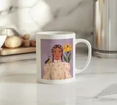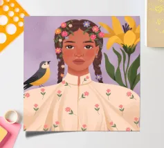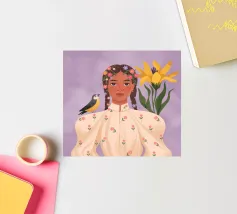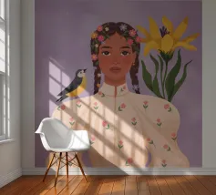 Questo dipinto raffigura una persona con un abito floreale e un uccello appollaiato sulla spalla. Lo sfondo è pieno di grandi fiori gialli e un morbido cielo viola, che creano un'atmosfera serena.