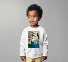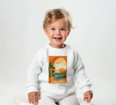 Una composizione minimalista presenta un vaso con una pianta verde davanti a una finestra ad arco, che mostra un paesaggio sereno con montagne, sole e lago in toni tenui. Le calde tonalità del marrone e del rosa creano un'atmosfera naturale e rilassante.