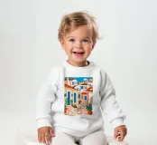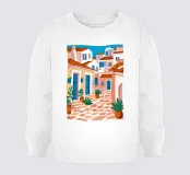 Una splendida illustrazione di un vicolo europeo baciato dal sole, con tetti in terracotta, balconi incantevoli e piante rigogliose. La luce calda e i dettagli pittoreschi creano un perfetto sogno di vacanza.