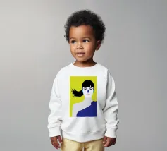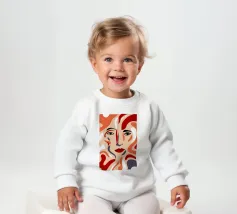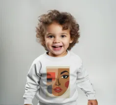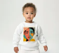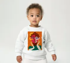 Un suggestivo ritratto astratto di un volto di donna, diviso in due metà, una nera e una bianca, con labbra rosse e capelli fluenti su un caldo sfondo arancione.
