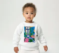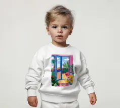 Scena d'interni di un soggiorno o di una zona pranzo, immersa in una luce viola e rosa, con piante, un tavolo apparecchiato e una finestra. Lo stile è moderno e suggestivo.