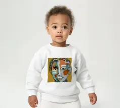 Questo dipinto presenta un volto dai molteplici colori e forme. Lo sfondo è un mix di arancione e verde acqua, che crea un effetto vibrante e dinamico.