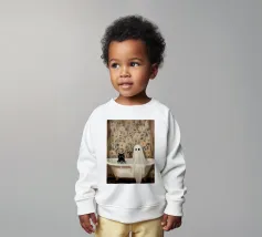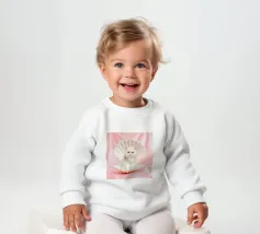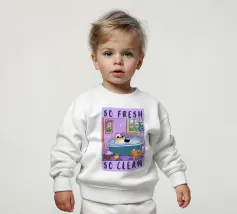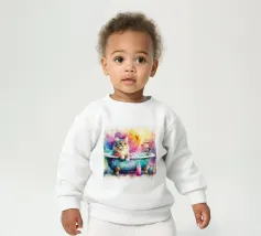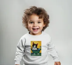 Un soffice gatto con gli occhi spalancati è seduto in una vasca da bagno piena di bolle, circondata da un bagno floreale azzurro e rosa. La scena offre un'espressione stravagante e leggermente sorpresa del gatto bagnato.