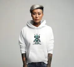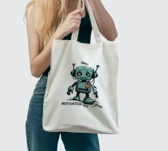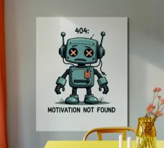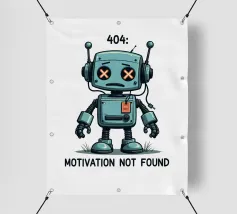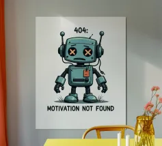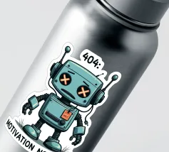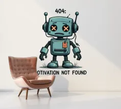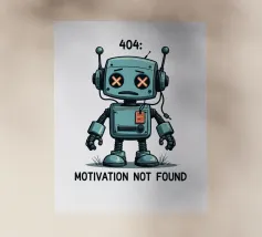 Un robot dei cartoni animati con segni di X sugli occhi si erge con un'espressione sconfortata sotto il testo "404. Motivazione non trovata": Motivation Not Found", creando un'interpretazione umoristica e simpatica di un comune messaggio di errore di Internet.