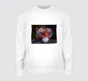 Una brocca bianca contiene un abbondante e traboccante bouquet di fiori in un tripudio di colori rosa, viola, rossi e gialli, dipinti in uno stile ricco, scuro e lunatico che sembra al tempo stesso classico ed espressivo.