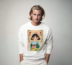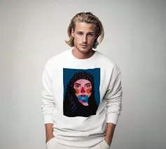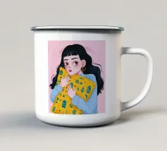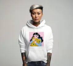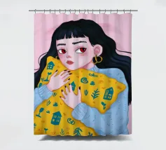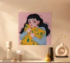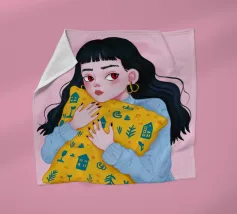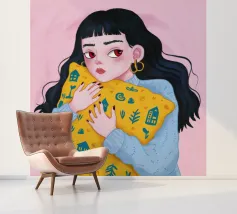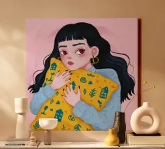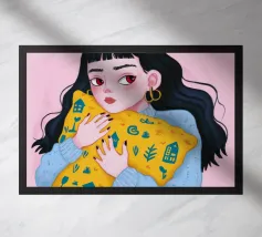 Questa opera d'arte raffigura una persona con i capelli scuri, che indossa un maglione blu e abbraccia un cuscino giallo con motivi di case. Lo sfondo è rosa, a sottolineare il tema accogliente e confortante.