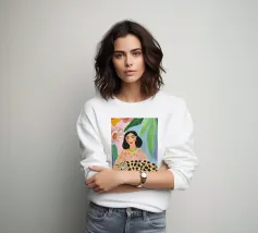 In tenui colori pastello, il ritratto mostra una giovane donna che abbraccia amorevolmente una tigre bianca, circondata da piante fiorite in giardino. Le delicate tonalità di rosa, azzurro e verde conferiscono all'illustrazione un'allegra atmosfera estiva. Quest'opera d'arte cattura il legame armonioso tra uomo e natura in una composizione incantevole.