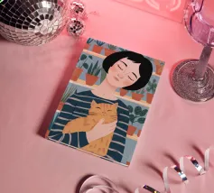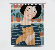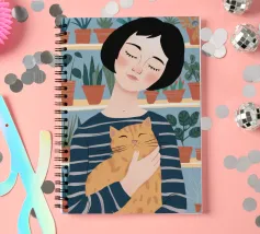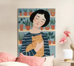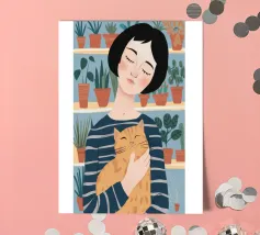 Una commovente illustrazione di una donna con una camicia a righe, con gli occhi chiusi, che abbraccia amorevolmente un grosso gatto rosso. Lo sfondo di piante in vaso contribuisce a creare un'atmosfera accogliente, da "genitore di piante e animali".