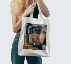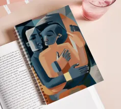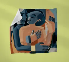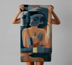Il dipinto raffigura due figure astratte che si abbracciano. Le figure sono composte da forme geometriche e colori tenui, principalmente tonalità di blu, arancione e beige. Le forme sovrapposte e l'uso di colori contrastanti creano un senso di profondità e intimità.