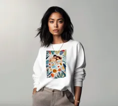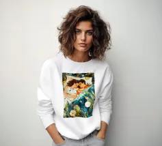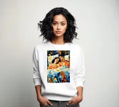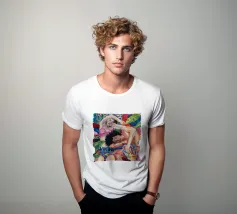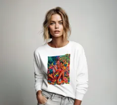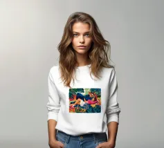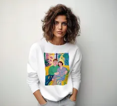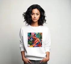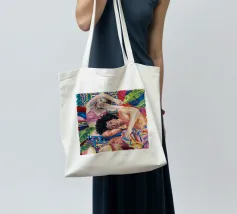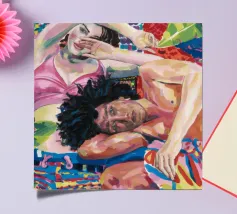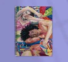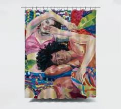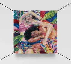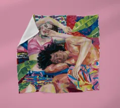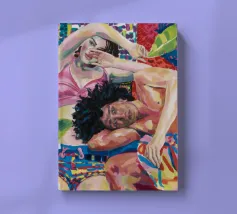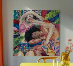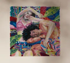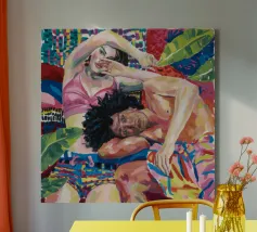 Questa opera d'arte raffigura due persone sdraiate insieme su uno sfondo colorato e tropicale. I colori vivaci e la posa intima trasmettono un senso di calore e connessione.