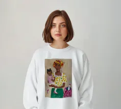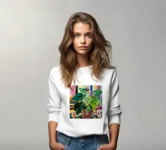 Questa opera d'arte raffigura due persone sdraiate insieme su uno sfondo colorato e tropicale. I colori vivaci e la posa intima trasmettono un senso di calore e connessione.