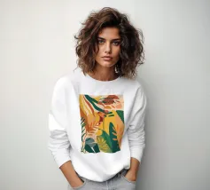 A modern abstract composition of various stylized botanical shapes and leaves in a palette of terracotta, beige, and dark blue against a light background.