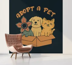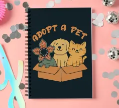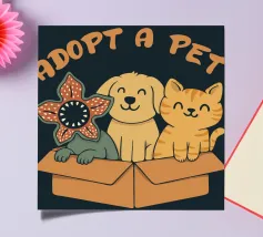 Una scatola piena di tenerezza... e una piccola sorpresa! Questo disegno mostra un cane felice, un gatto sorridente e un demogorgone inaspettatamente adorabile, tutti in attesa di essere "adottati". È un mix perfetto di dolcezza e sciocchezza, pensato per gli amanti degli animali, per gli appassionati di geek e per tutti coloro che amano un buon tocco di cultura pop.
