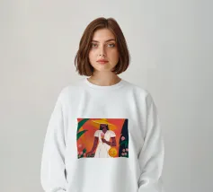 Un ritratto sorprendente di una donna di colore con un cappello da sole giallo brillante, circondata da arance. Il suo sguardo diretto e sicuro e i colori vivaci creano un'immagine potente, bella e solare.