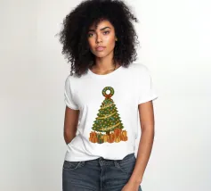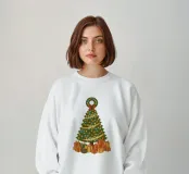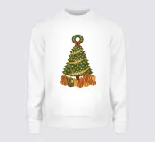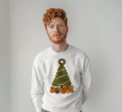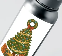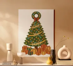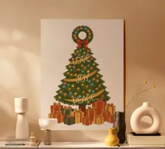 Un albero di Natale vintage si erge con i suoi rami che formano una classica silhouette triangolare. Gli aghi sono di un verde intenso e ricco, disposti a strati morbidi che si restringono gradualmente verso la cima. L'albero è avvolto da luci scintillanti, minuscole sfere di colore giallo, blu e rosso che punteggiano il fogliame come stelle. Tre parole attraversano il corpo dell'albero in uno stile fluido e scritto a mano: "AMORE" vicino ai rami superiori, "GIOIA" al centro e "PACE" più vicino alla base. In cima si trova una corona verde decorata con un fiocco rosso brillante. Sotto l'albero ci sono doni e regali di Natale.