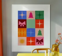 Aggiungete un tocco di fascino giocoso al vostro arredamento natalizio con questa colorata illustrazione astratta dell'albero di Natale. Realizzato con audaci forme grafiche ritagliate in un allegro arcobaleno di colori pastello (rosa, giallo, arancione, verde e sormontato da una sorprendente stella nera), questo disegno dà un tocco moderno alle tradizionali icone natalizie. Su uno sfondo rosa tenue, crea un'atmosfera femminile e festosa, fresca ed elegante. Perfetta per l'arte murale, i cuscini, le decorazioni per la casa e per i regali di Natale, questa illustrazione illuminerà sicuramente la vostra stagione natalizia con la sua estetica unica e gioiosa.