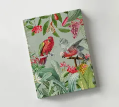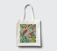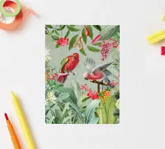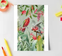Questo collage vintage emana un'eleganza tropicale con un'accattivante miscela di foglie lussureggianti e frutti vivaci. Al centro, due straordinari cacatua rossi si appollaiano con grazia, con le loro piume infuocate che creano un drammatico punto focale. Il loro piumaggio audace e vibrante contrasta meravigliosamente con la ricca vegetazione e i frutti tropicali che li circondano. Le sottili texture vintage sullo sfondo aggiungono un senso di fascino senza tempo, mentre i colori vivaci danno vita alla scena, evocando un senso di lusso esotico e di bellezza naturale in un paradiso lussureggiante.