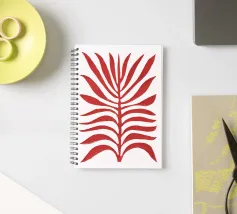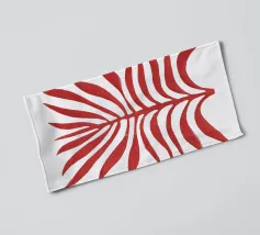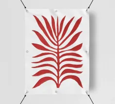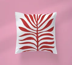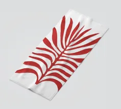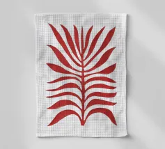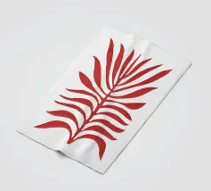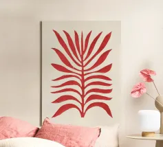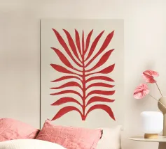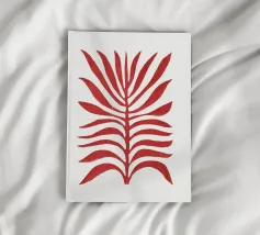 Questa immagine mostra una rappresentazione stilizzata di un singolo ramo con foglie allungate. Il disegno è minimalista e utilizza un colore rosso deciso, simile a uno stencil o a una stampa a blocchi. Il ramo attraversa verticalmente il centro della composizione e le foglie si estendono simmetricamente su entrambi i lati. Ogni foglia è semplice e astratta, con punte appuntite e lunghezze variabili, che creano un senso di movimento e ritmo. L'estetica complessiva è pulita e moderna e mette in risalto la forma e il contrasto con lo sfondo chiaro.