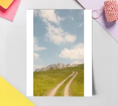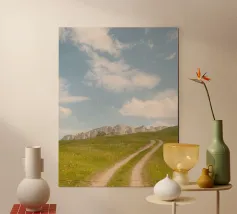 Un tortuoso sentiero sterrato si snoda attraverso un prato alpino di un verde intenso, punteggiato di fiori selvatici, e conduce verso drammatiche scogliere calcaree sotto un tenue cielo nuvoloso. Questo sereno sentiero di montagna cattura la bellezza pacifica dei paesaggi escursionistici svizzeri e il fascino senza tempo dei sentieri rurali di montagna. Perfetto per portare un senso di avventura e tranquillità naturale in qualsiasi spazio.
