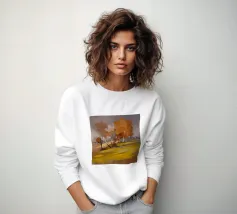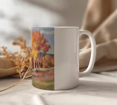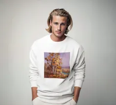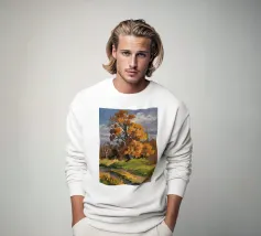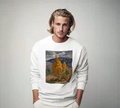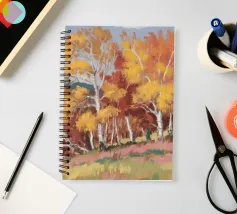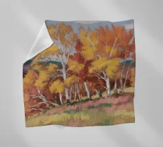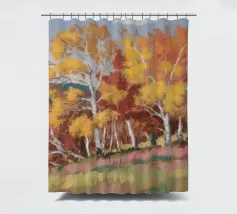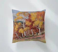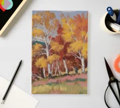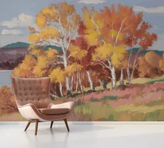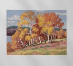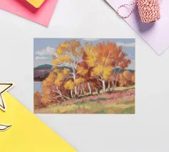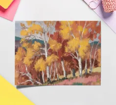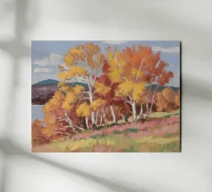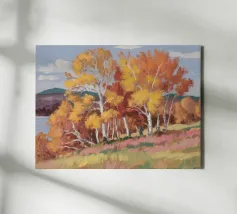 Una tranquilla scena autunnale incentrata su un boschetto di betulle o di pioppi, le cui foglie sono diventate di un brillante color ambra e giallo, sullo sfondo di alberi distanti e di un cielo calmo e smorzato.