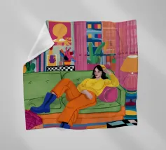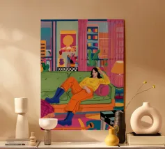 Illustrazione di tre amici diversi che si rilassano e chiacchierano su un divano colorato in una stanza arredata con stile. La scena è una celebrazione calda, vibrante e gioiosa dell'amicizia e della vita moderna.