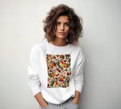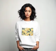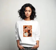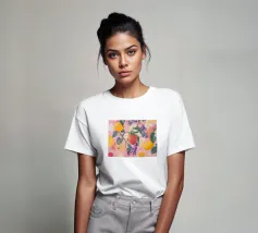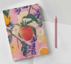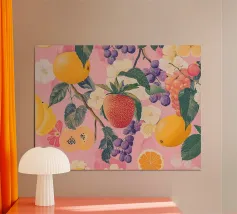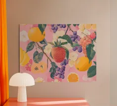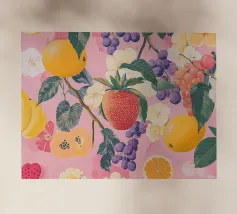 Un collage colorato di frutta fresca e fiori di ciliegio in tenui colori pastello che dà vita all'estate su uno sfondo rosa. Ideale per gli amanti del mercato della frutta e della natura!