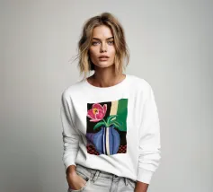 Natura morta con un ananas in un vaso a righe bianche e marroni. Un singolo fiore e un pezzo di frutta sono appoggiati accanto ad esso, creando una composizione eccentrica, moderna ed elegante su uno sfondo a righe blu.