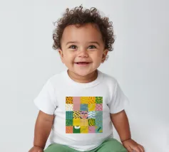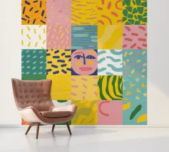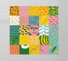 Una composizione astratta vibrante ed energica con un volto stilizzato integrato in un patchwork colorato di motivi geometrici. L'opera è un'esplorazione moderna e giocosa dell'identità e della forma.