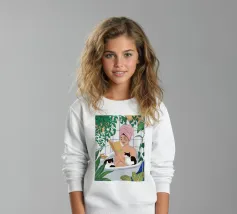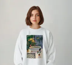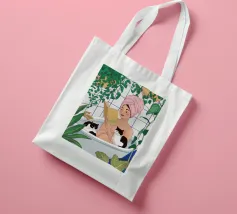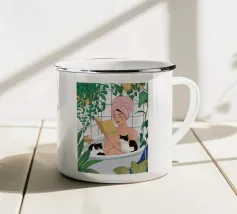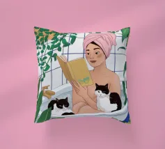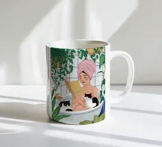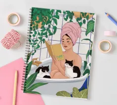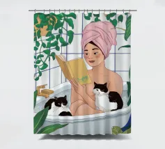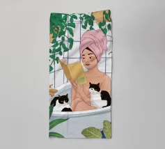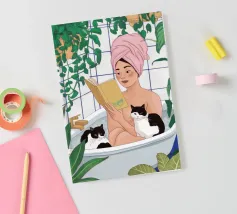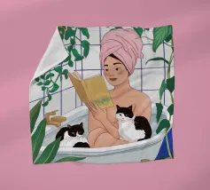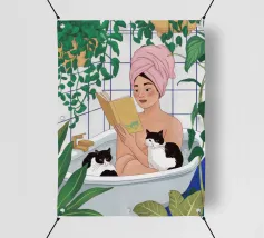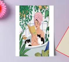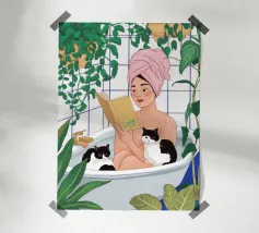 Un'illustrazione affascinante e stravagante di una donna con un turbante di asciugamani, che si rilassa in una vasca da bagno con il suo gatto seduto giocosamente sul bordo. Il bagno è pieno di piante, creando una scena di eccentrica e lussuosa cura di sé.